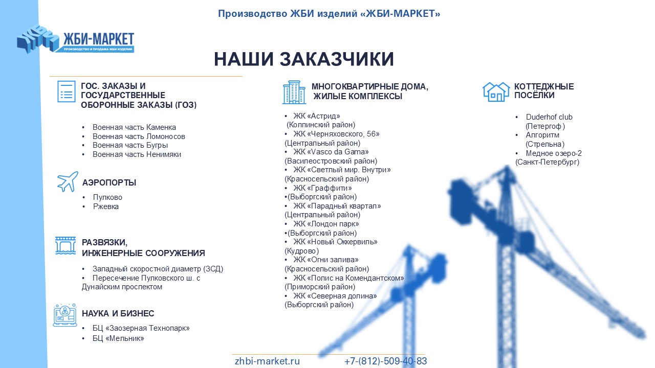 "ЖБИ-Маркет" - это надежный поставщик железобетонных изделий в Усть-Луге и Ленинградской области. Мы успешно работаем с 2010 года и за это время заслужили репутацию надежного и ответственного партнера.
